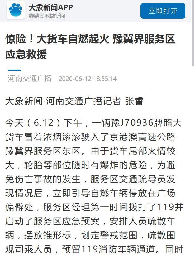 河南交通廣播以題為《驚險!大貨車自燃起火 豫冀界服務區應急救援》在大象新聞、今日頭條對豫冀界服務區應急救援進行了報道